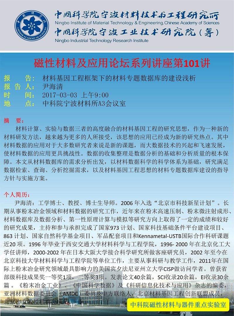3月3日:尹海清:材料基因工程框架下的材料专题数据库的建设浅析