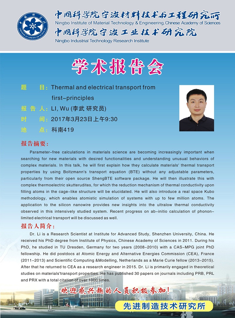 3月23日:Li Wu(李武):Thermal and electrical transport from first-principles