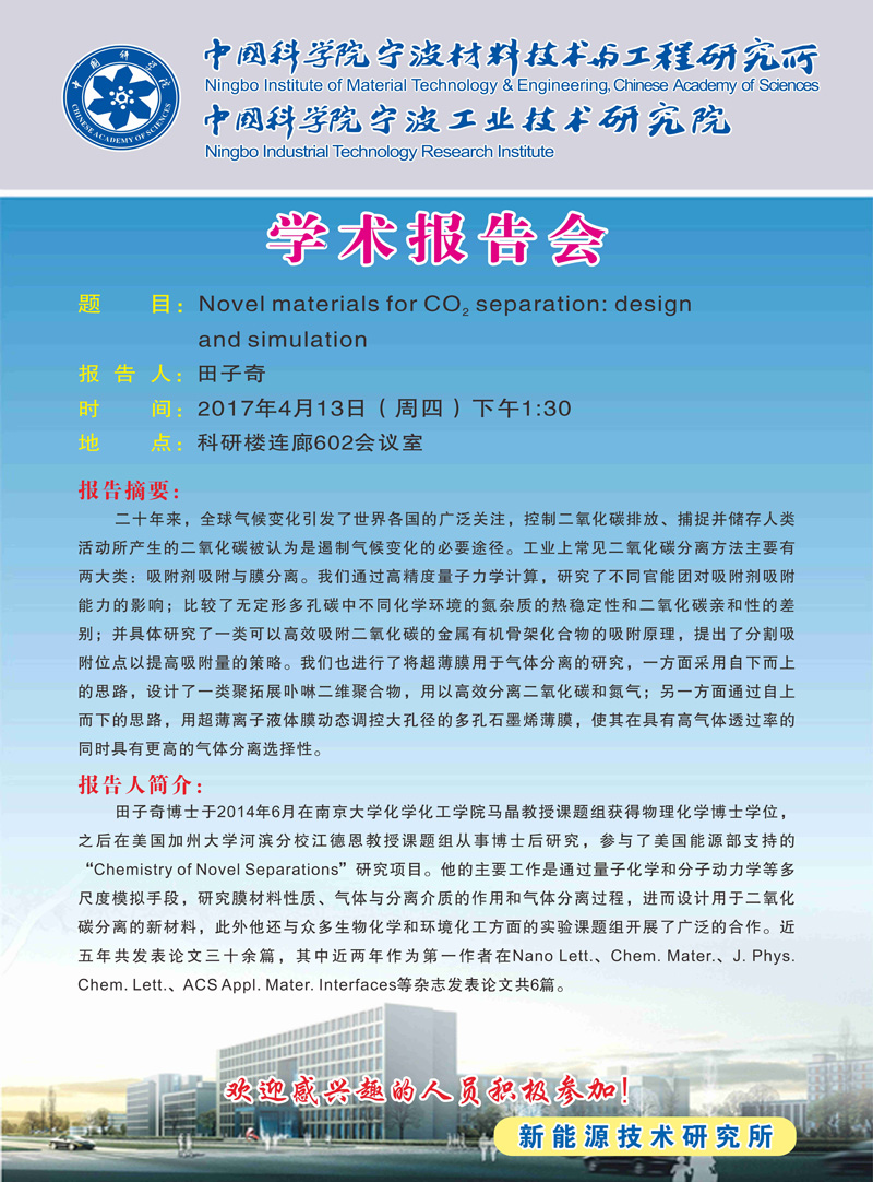 4月13日:田子奇:Novel materials for CO2 separation: design and simulation