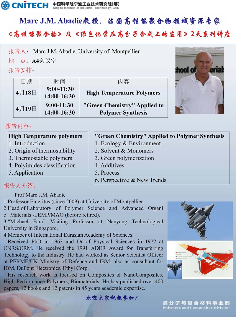 4月18-19日:Marc J.M.Abadie:高性能聚合物及绿色化学在高分子合成上的应用