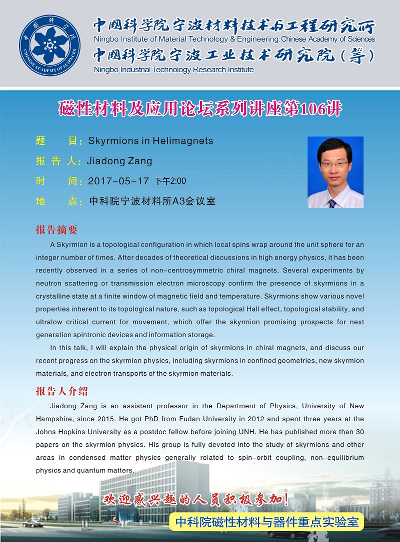 5月17日:Jiadong Zang:Skyrmious in Helimagnets