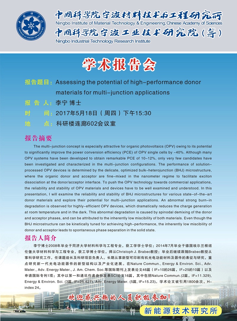 5月18日:李宁:Assessing the potential of high-performance donor materials for multi-junction applications 发布:2017-05-05 点赞: 字号:小 大 打印: