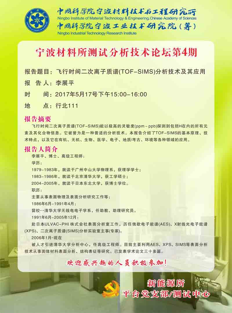 5月17日:李展平:飞行时间二次离子质谱(TOF-SIMS)分析技术及其应用