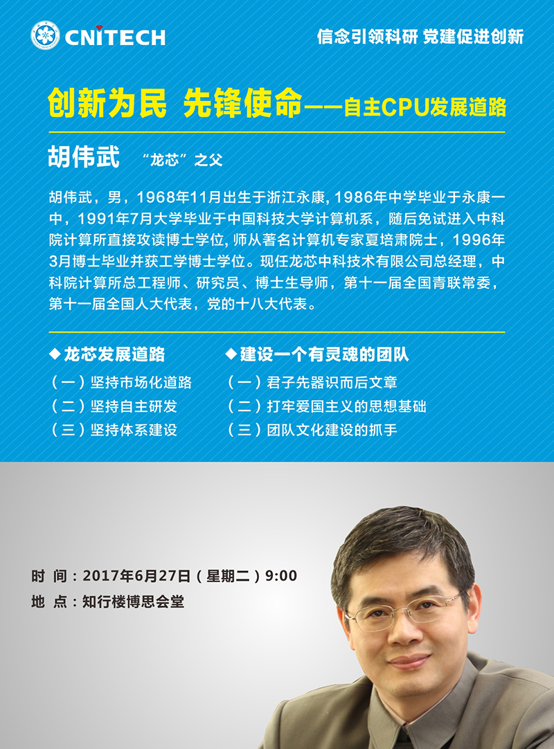 6月27日:人文大讲堂:胡伟武:创新为民 先锋使命——自主CPU发展道路
