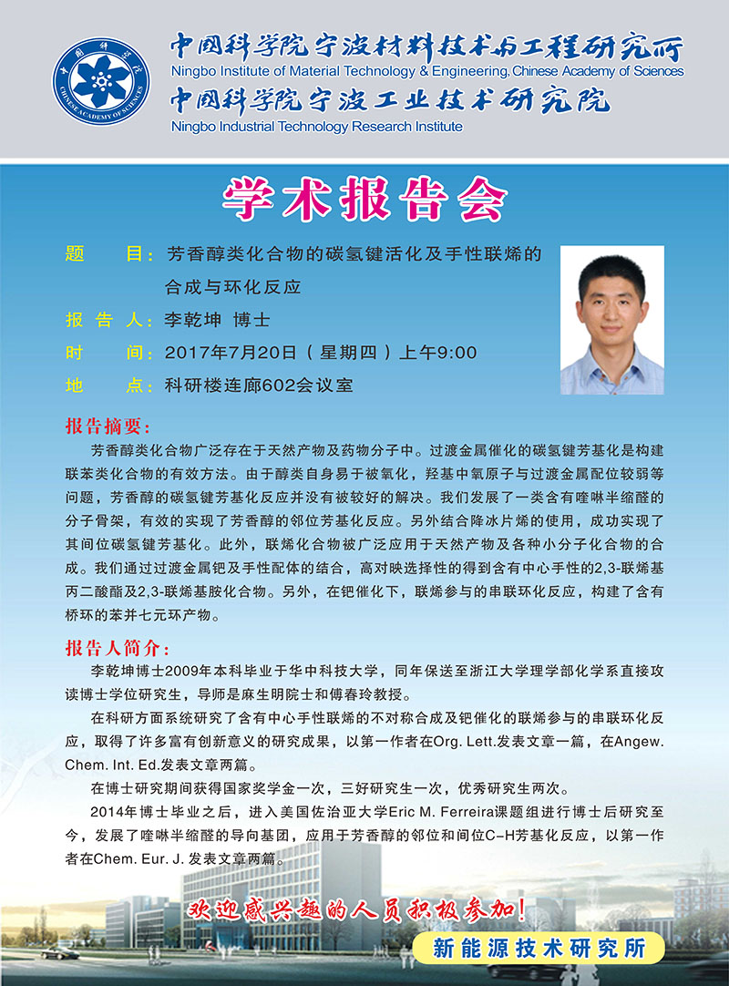 7月20日:李乾坤:芳香醇类化合物的碳氢键活化及手性联烯的合成与环化反应