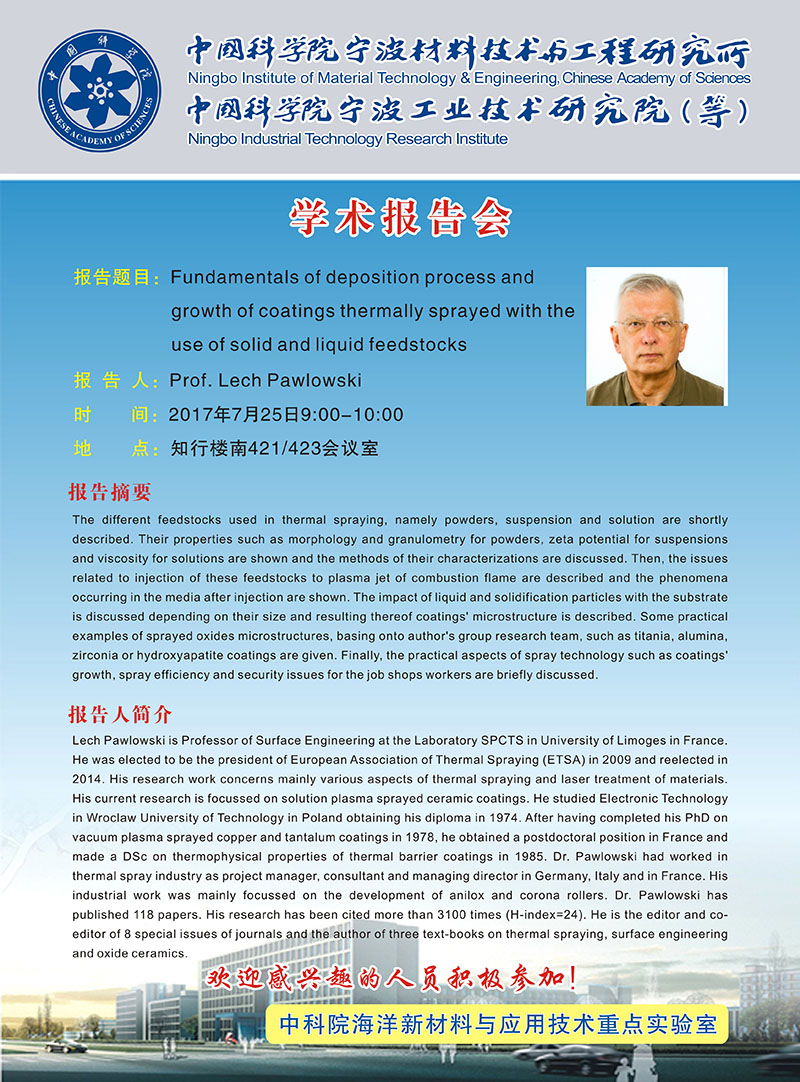 7月25日:Lech Pawlowski:Fundamentals of deposition process and growth of coatings thermally sprayed with the use of solid and liquid feedstocks 发布:2017-07-19 点赞: 字号:小 大 打印: