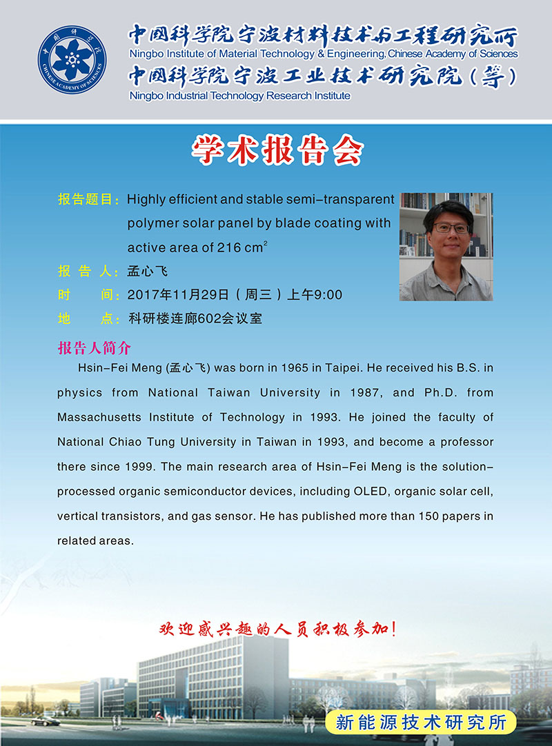 11月29日:孟心飞:Highly efficient and stable semi-transparent polymer solar panel by blade coating with active area of 216 cm2 发布:2017-11-24 点赞: 字号:小 大 打印: