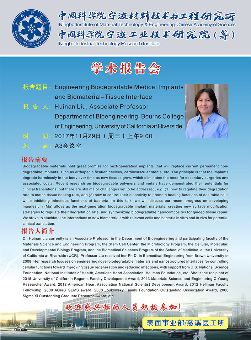 11月29日:Huinan Liu, Associate Professor:Engineering Biodegradable Medical Implants and Biomaterial-Tissue Interface 发布:2017-11-24 点赞: 字号:小 大 打印: