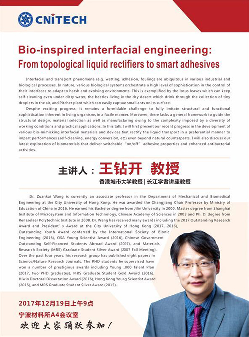 12月19日:王钻开:Bio-inspired interfacial engineering:From topological liquid rectifiers to smart adhesives 发布:2017-12-13 点赞: 字号:小 大 打印: