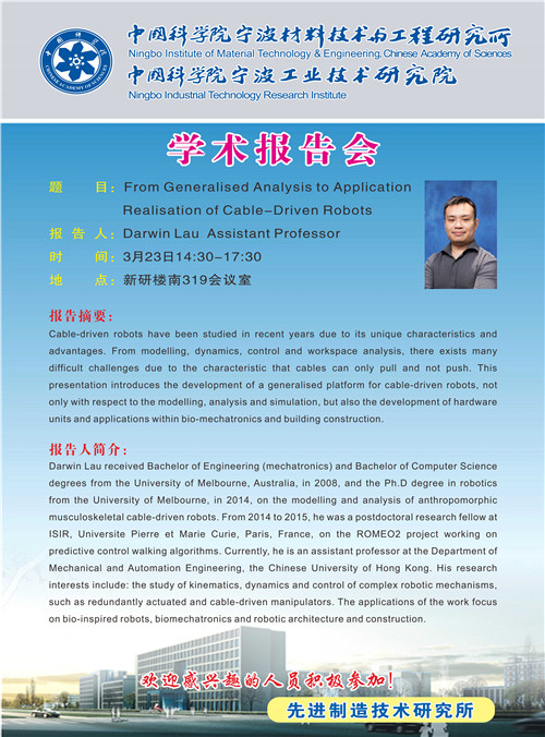 3月23日:Darwin Lau:From Generalised Analysis to Application Realisation of Cable-Driven Robots 发布:2018-03-20 点赞: 字号:小 大 打印: