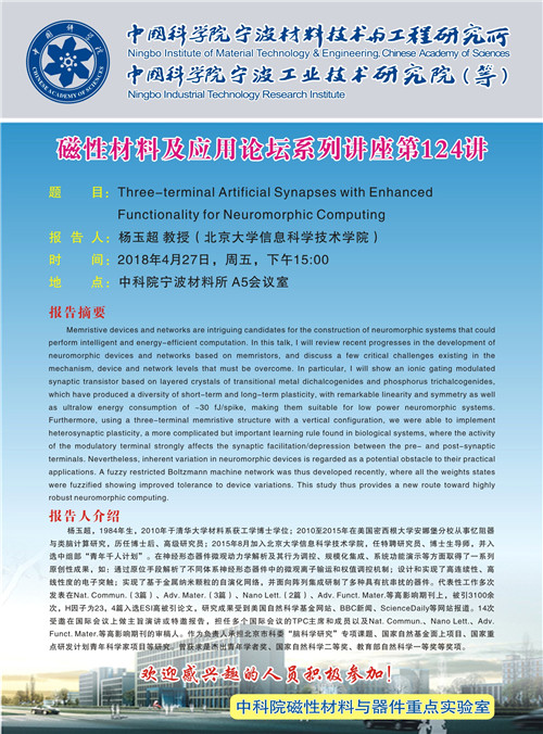 4月27日:杨玉超:Three-terminal Artificial Synapses with Enhanced Functionality for Neuromorphic Computing 发布:2018-04-24 点赞: 字号:小 大 打印: