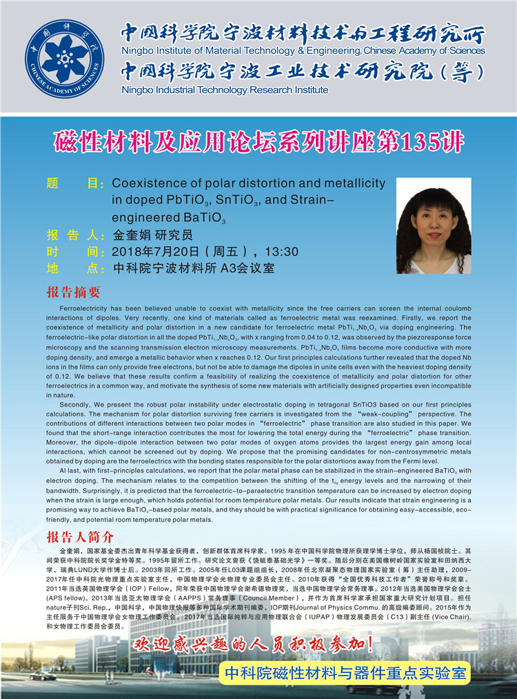 7月20日:金奎娟:Coexistence of polar distortion and metallicity in doped PbTiO3, SnTiO3, and Strain-engineered BaTiO3 发布:2018-07-18 点赞: 字号:小 大 打印: