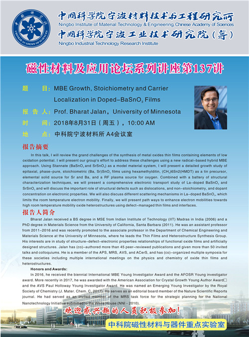 8月31日:Bharat Jalan:MBE Growth,Stoichiometry and Carrier Localization in Dopedo-BasnO3 Films 发布:2018-08-27 点赞: 字号:小 大 打印: