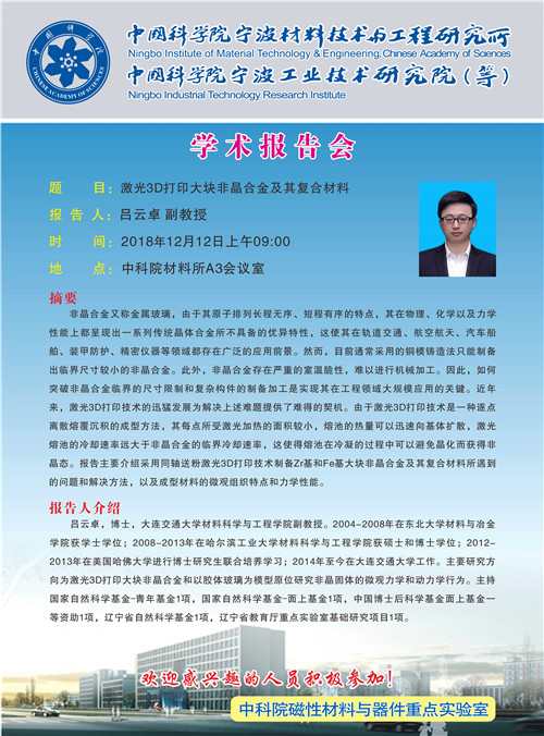 12月12日:吕云卓:激光3D打印大块非晶合金及其复合材料