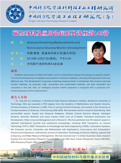 12月27日:何静:Glucose Screening Measurements and Noninvasive Glucose Monitor Development 发布:2018-12-27 点赞: 字号:小 大 打印: