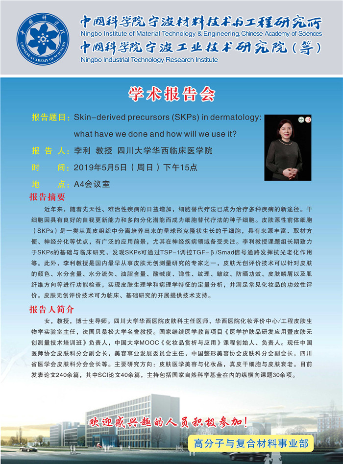 5月5日:李利:Skin-derived precursors (SKPs) in dermatology: what have we done and how will we use it? 发布:2019-05-05 点赞: 字号:小 大 打印: