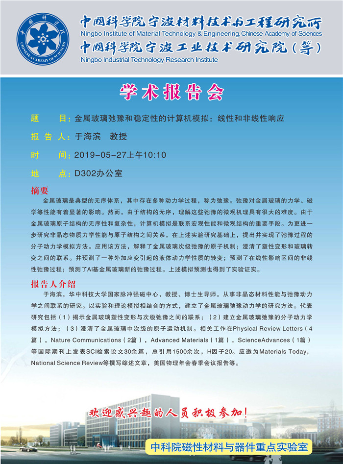 5月27日:于海滨:金属玻璃弛豫和稳定性的计算机模拟:线性和非线性响应