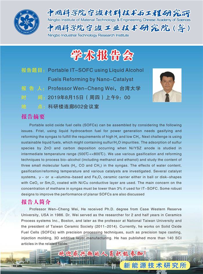 8月15日:Wen-Cheng Wei:Portable IT-SOFC using Liquid Alcohol Fuels Reforming by Nano-Catalyst 发布:2019-08-15 点赞: 字号:小 大 打印: