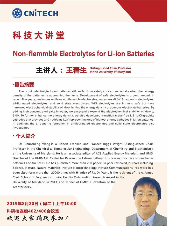 8月20日:科技大讲堂:王春生:Non-flemmble Electrolytes for Li-ion Batteries