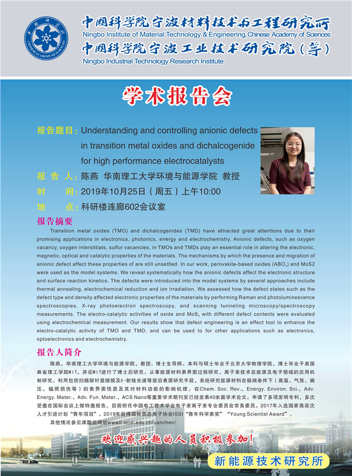 10月25日:陈燕:Understanding and controlling anionic defects in transition metal oxides and dichalcogenide for high performance electrocatalysts 发布:2019-10-25 点赞: 字号:小 大 打印: