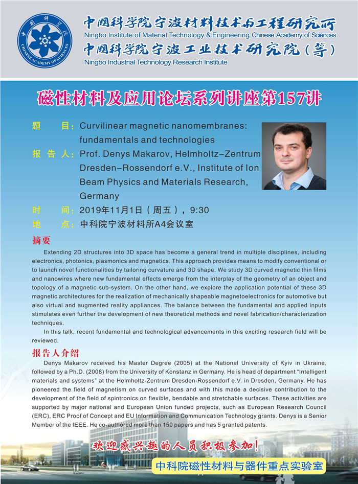 11月1日:Denys Makarov:Curvilinear magnetic nanomembranes:fundamentals and technologies 发布:2019-11-01 点赞: 字号:小 大 打印: