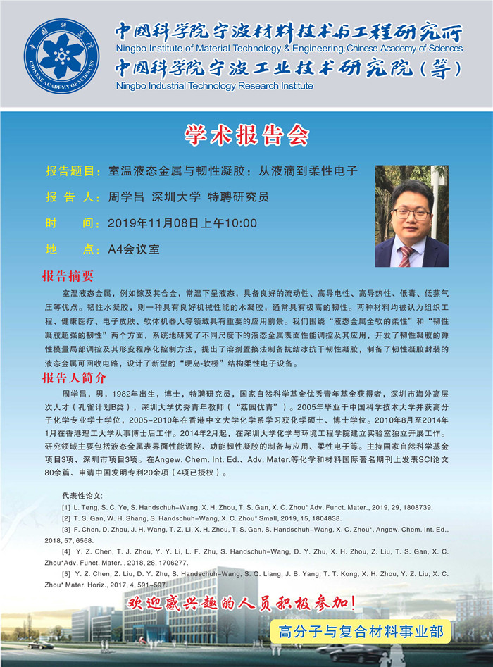 11月8日:周学昌:室温液态金属与韧性凝胶:从液滴到柔性电子
