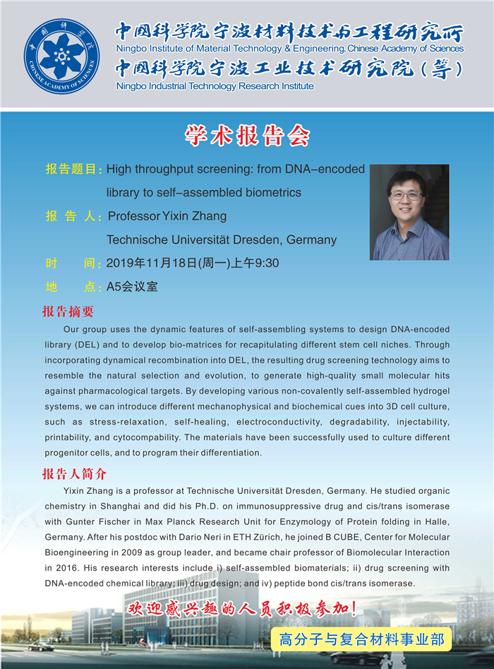 11月18日:Yixin Zhang:High throughput screening: from DNA-encoded library to self-assembled biometrics 发布:2019-11-18 点赞: 字号:小 大 打印: