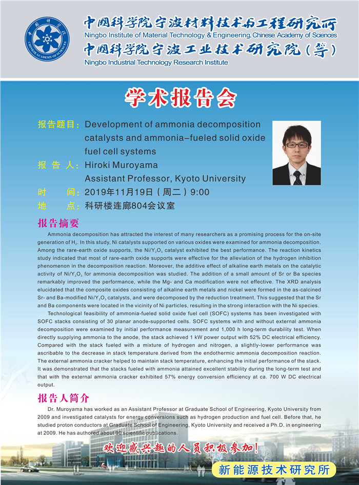 11月19日:Hiroki Muroyama:Development of ammonia decomposition catalysts and ammonia-fueled solid oxide fuel cell systems 发布:2019-11-19 点赞: 字号:小 大 打印: