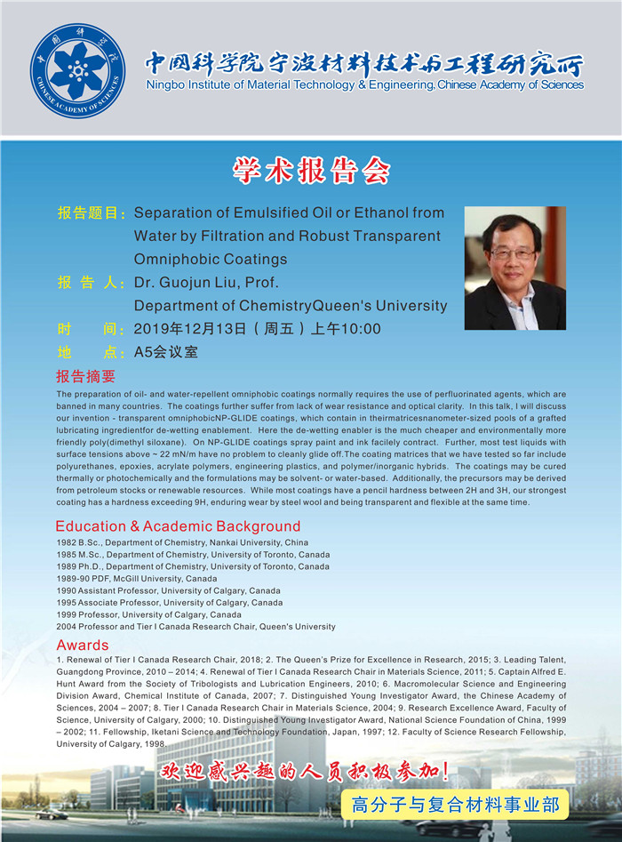 12月13日:Guojun Liu:Separation of Emulsified Oil or Ethanol from Water by Filtration and Robust Transparent Omniphobic Coatings 发布:2019-12-13 点赞: 字号:小 大 打印: