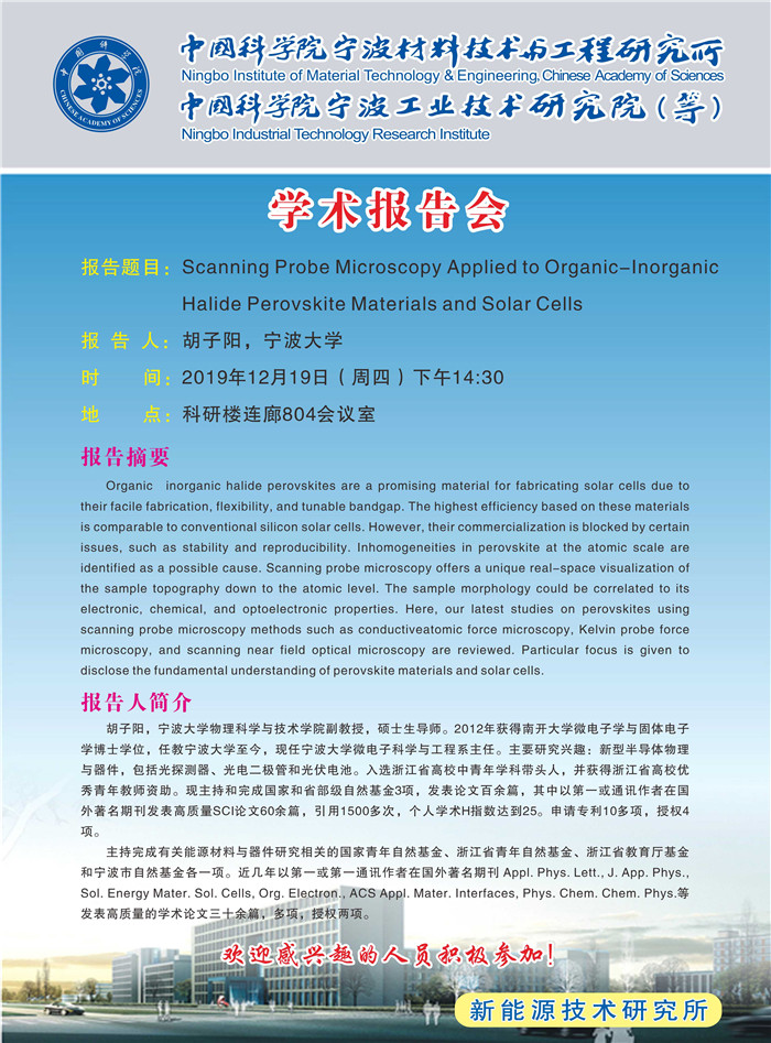 12月19日:胡子阳:Scanning Probe Microscopy Applied to Organic–Inorganic Halide Perovskite Materials and Solar Cells 发布:2019-12-19 点赞: 字号:小 大 打印:
