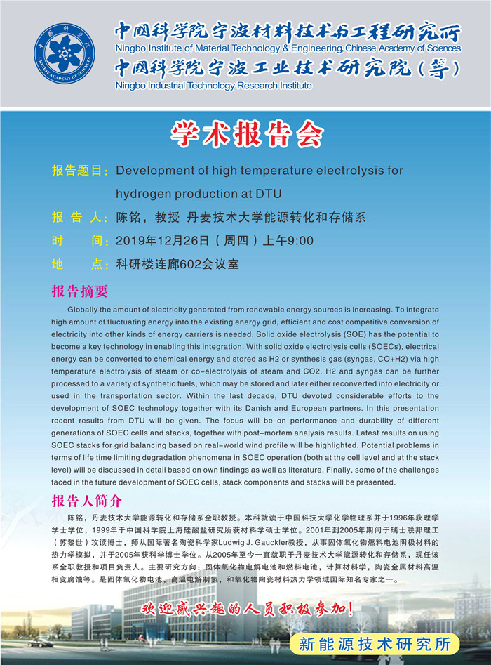 12月26日:陈铭:Development of high temperature electrolysis for hydrogen production at DTU 发布:2019-12-26 点赞: 字号:小 大 打印: