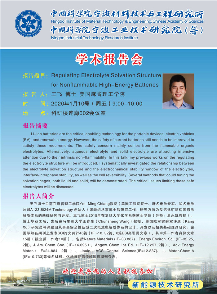 1月10日:王飞:Regulating Electrolyte Solvation Structure for Nonflammable High-Energy Batteries 发布:2020-01-10 点赞: 字号:小 大 打印: