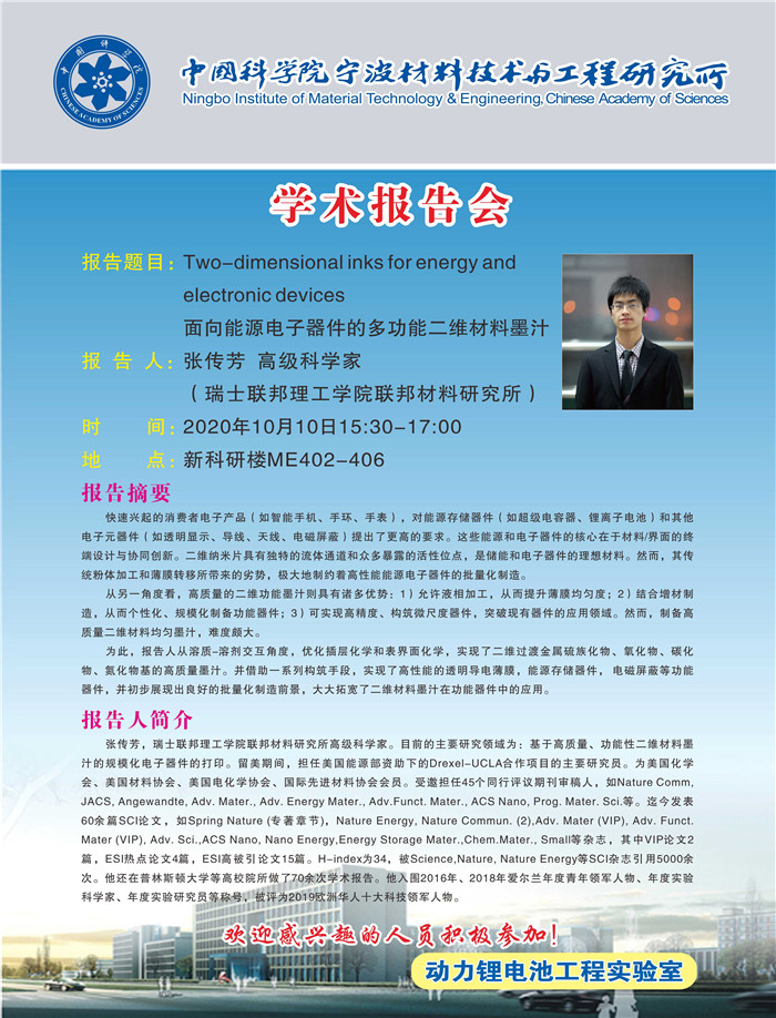10月10日:张传芳:Two-dimensional inks for energy and electronic devices(面向能源电子器件的多功能二维材料墨汁) 发布:2020-10-10 点赞: 字号:小 大 打印: