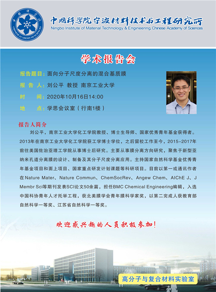 10月16日:刘公平:面向分子尺度分离的混合基质膜