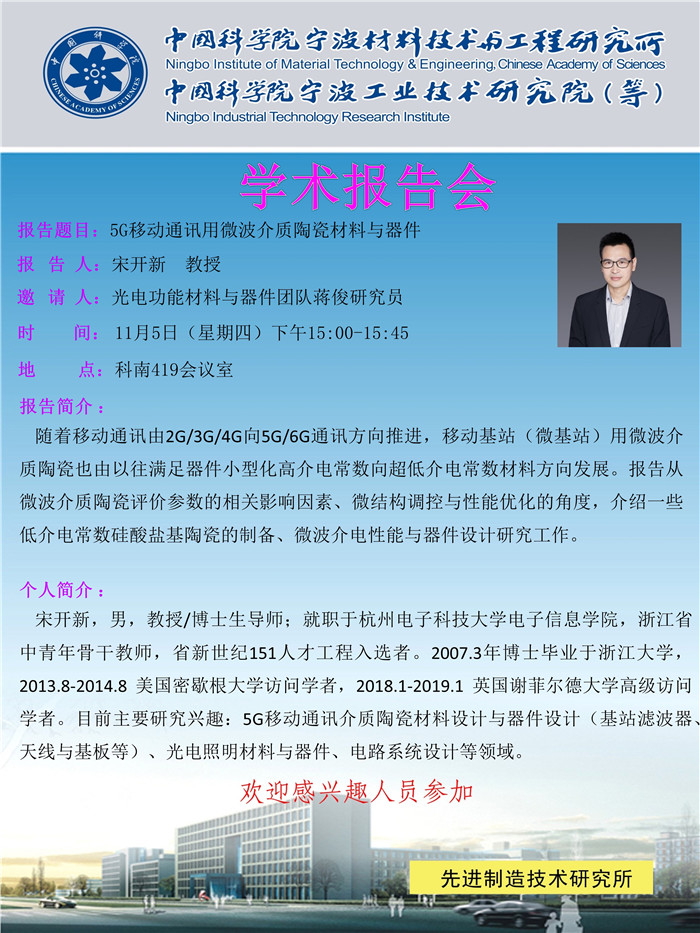 11月5日:宋开新:5G移动通讯用微波介质陶瓷材料与器件