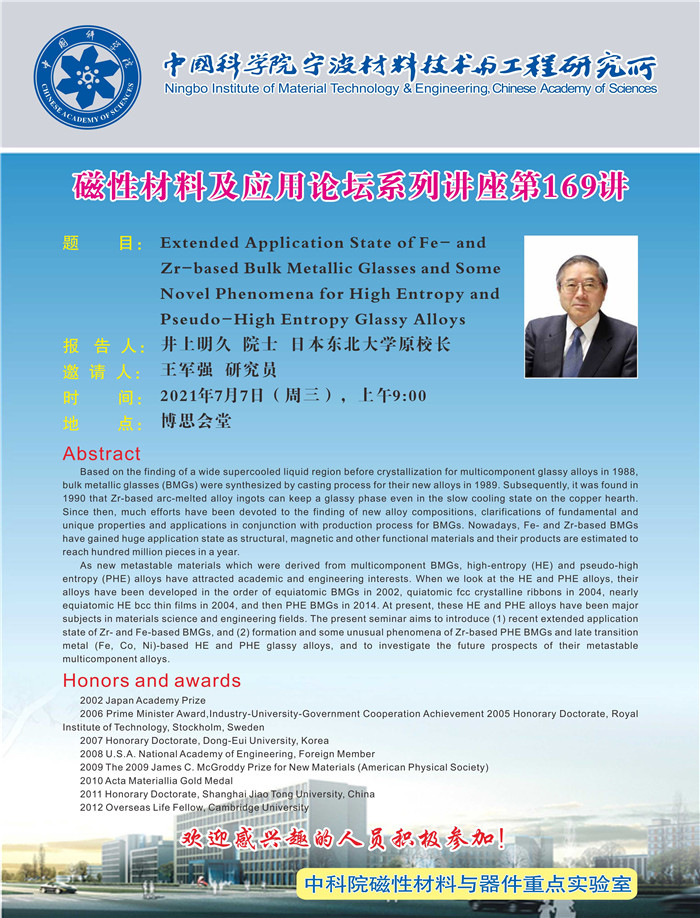 7月7日:井上明久:Extended Application State of Fe- and Zr-based Bulk Metallic Glasses and Some Novel Phenomena for High Entropy and Pseudo-High Entropy Glassy Alloys 发布:2021-07-07 点赞: 字号:小 大 打印:
