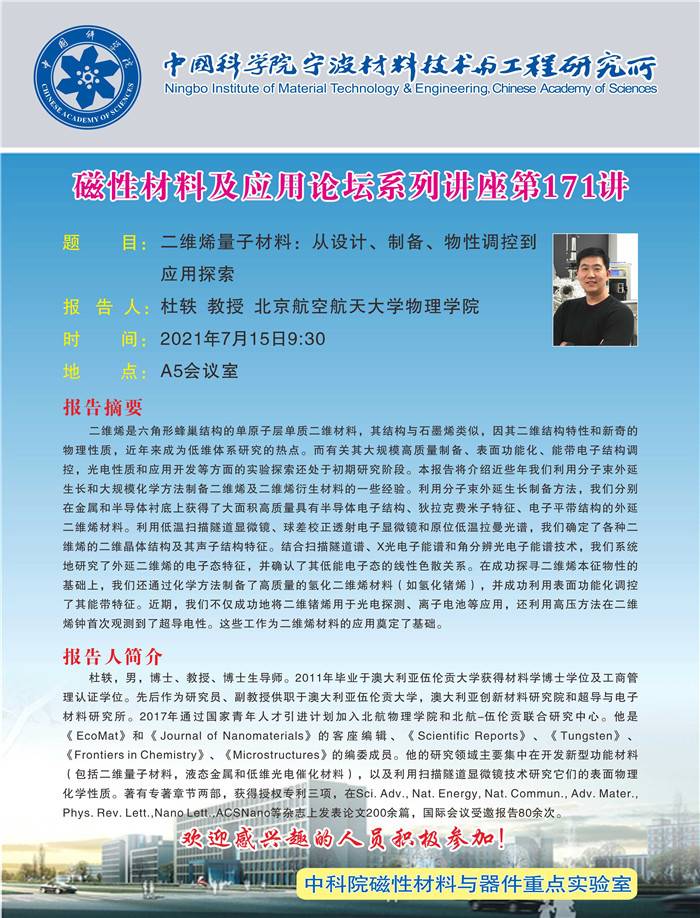 7月15日:杜轶:二维烯量子材料:从设计、制备、物性调控到应用探索