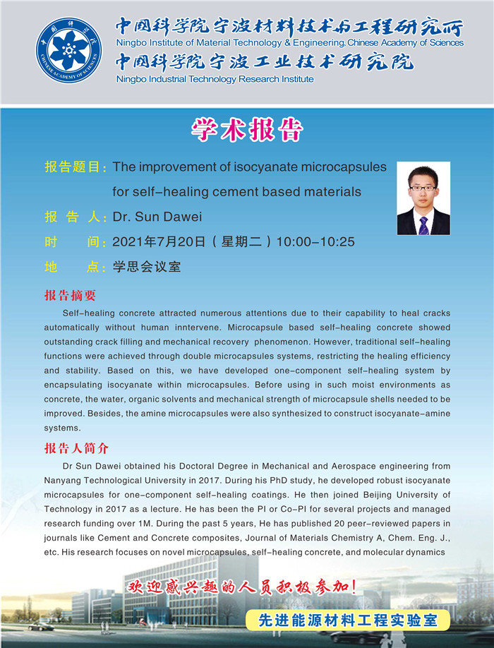 7月20日:Sun Dawei:The improvement of isosyanate microcapsules for self-healing cement based materials 发布:2021-07-20 点赞: 字号:小 大 打印: