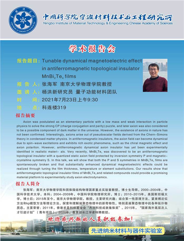 7月23日:张海军:Tunable dynamical magnetoelectirc effect in antiferromagnetic topological insulator MnBi2Te4 films 发布:2021-07-23 点赞: 字号:小 大 打印:
