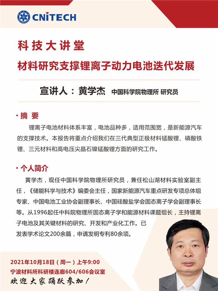 10月18日:科技大讲堂:黄学杰:材料研究支撑锂离子动力电池迭代发展