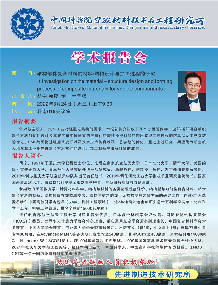 8月24日:胡宁:结构部件复合材料的材料结构设计与加工过程的研究