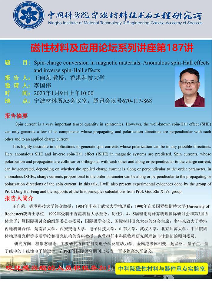 1月9日:王向荣:Spin-charge conversion in magnetic materials: Anomalous spin-Hall effects and inverse spin-Hall effects 发布:2023-01-09 点赞: 字号:小 大 打印: