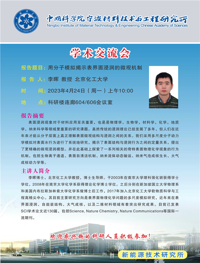 4月24日:李晖:用分子模拟揭示表界面浸润的微观机制