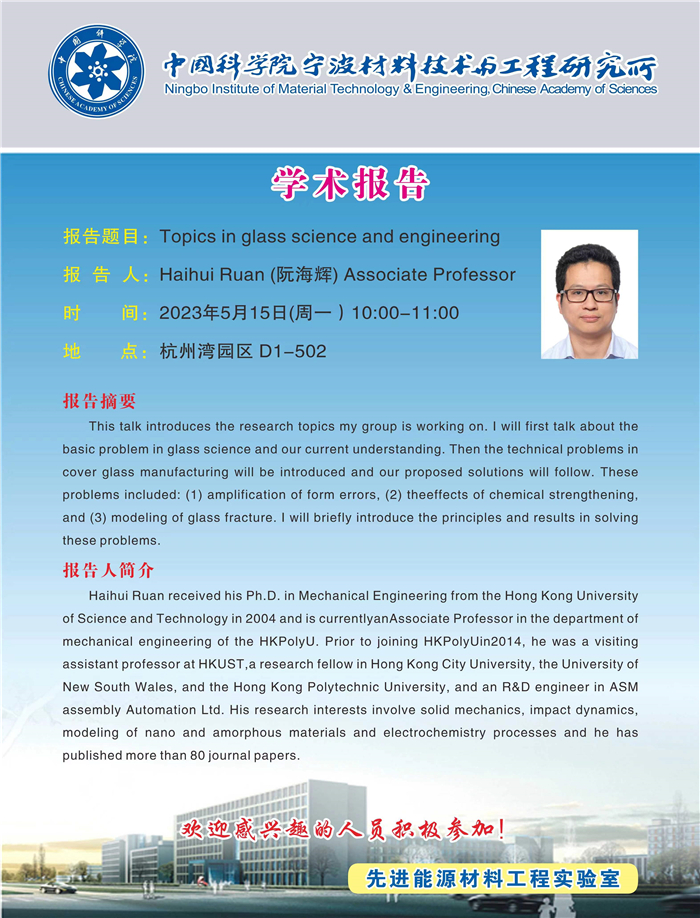 5月15日:阮海辉:Topics in glass science and engineering