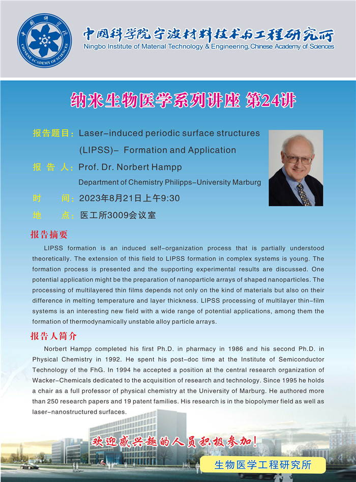 8月21日:Norbert Hampp:Laser-induced periodic surface structures(LIPSS)-Formation and Application 发布:2023-08-21 点赞: 字号:小 大 打印: