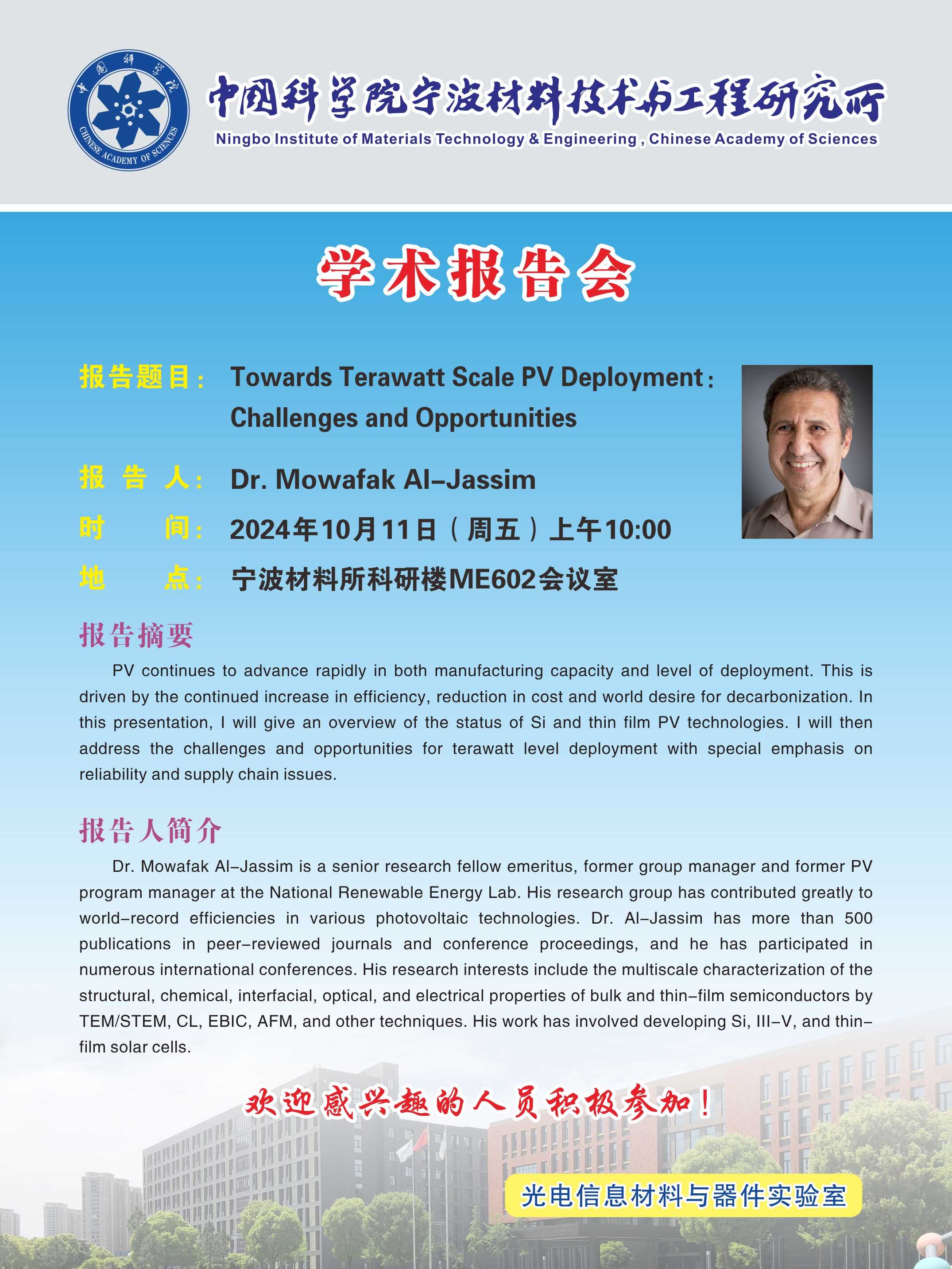 10月11日:Dr. Mowafak Al-Jassim:Towards Terawatt Scale PV Deployment:Challenges and Opportunities 发布:2024-10-02 点赞: 字号:小 大 打印:
