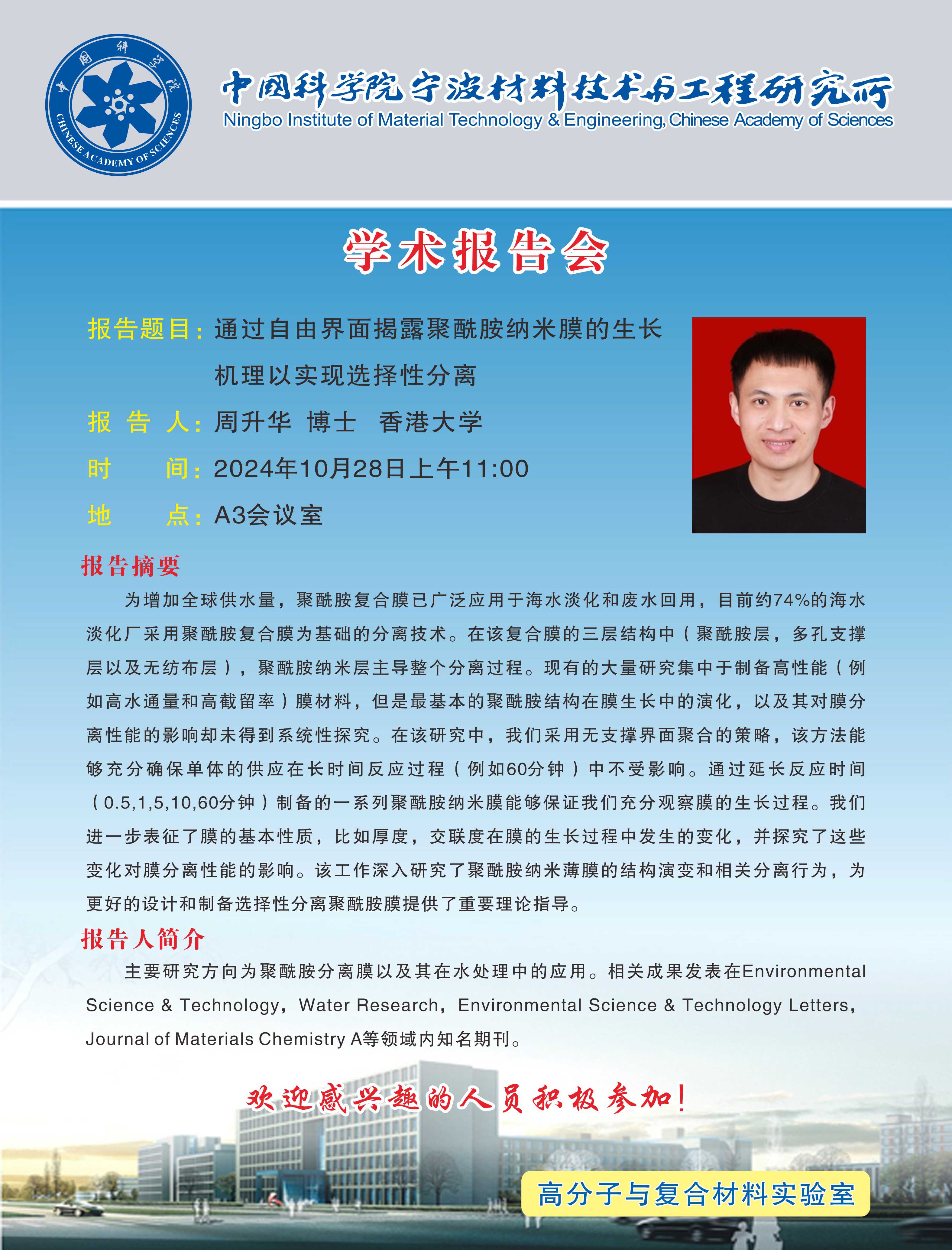 10月28日:周升华:通过自由界面揭露聚酰胺纳米膜的生长机理以实现选择性分离
