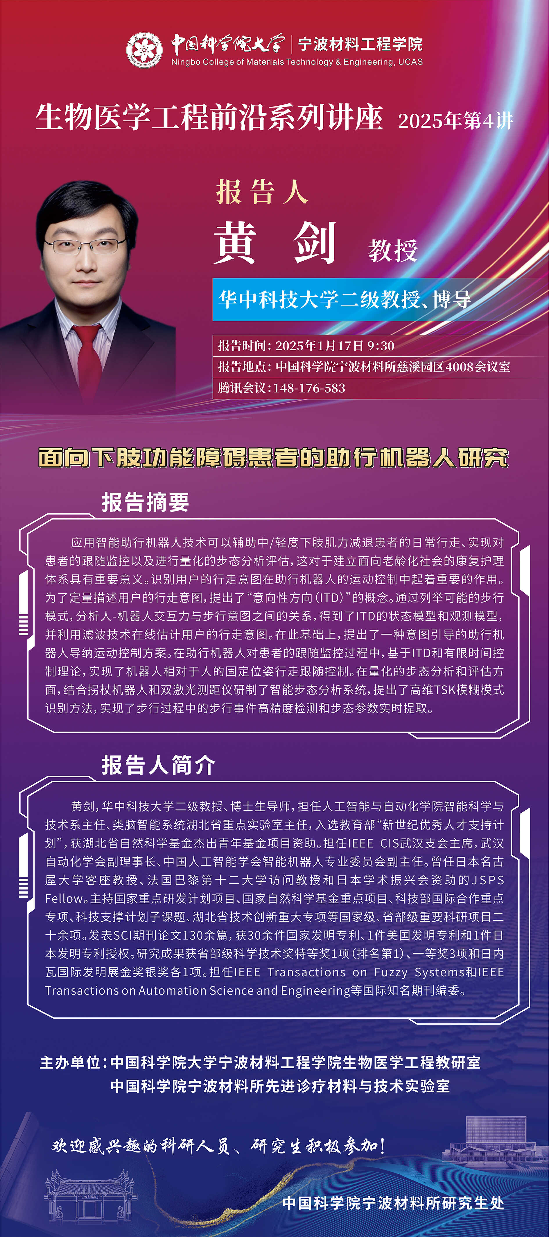 1月17日:黄剑:面向下肢功能障碍患者的助行机器人研究