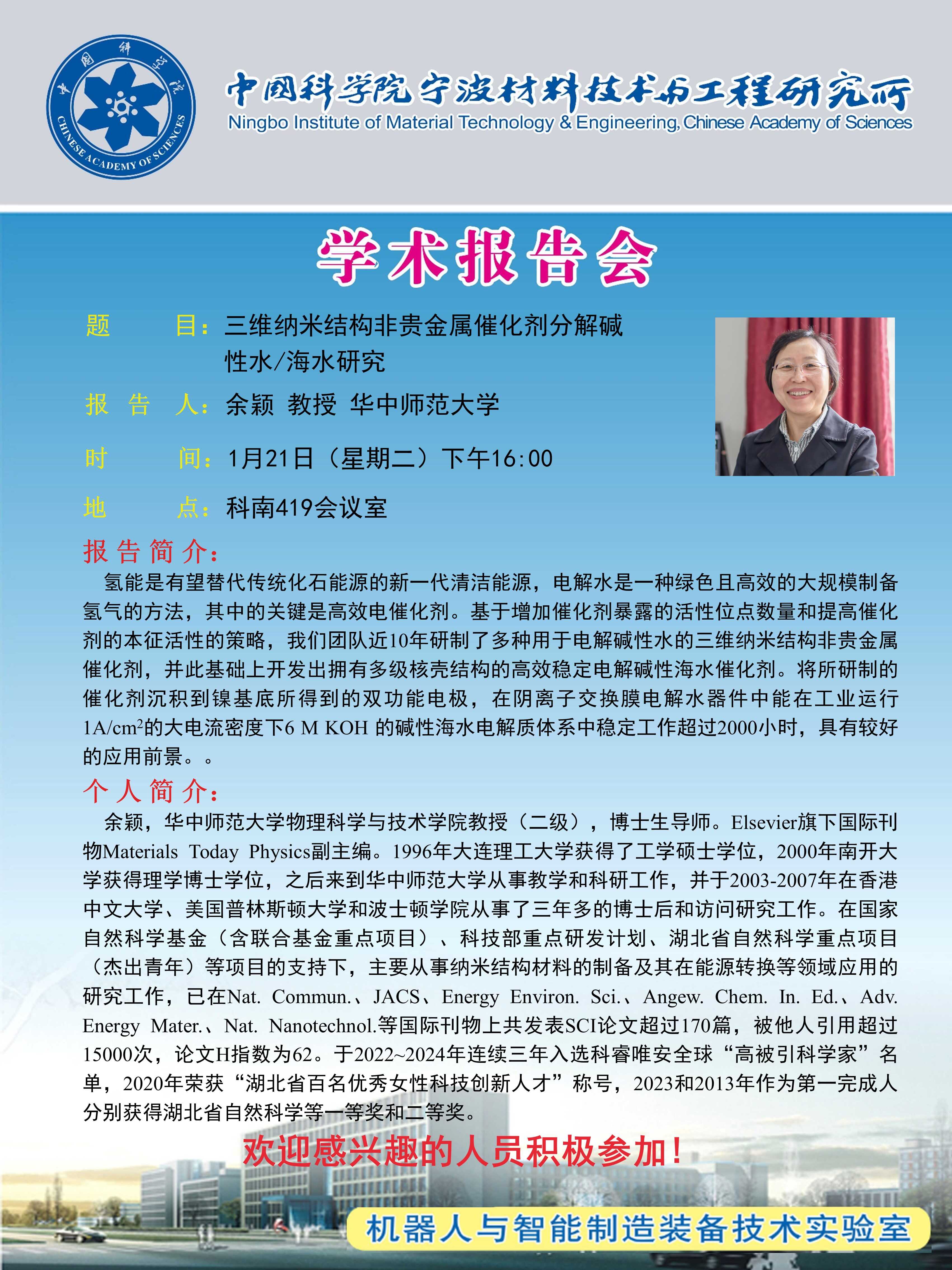 1月21日:余颖:三维纳米结构非贵金属催化剂分解碱性水/海水研究