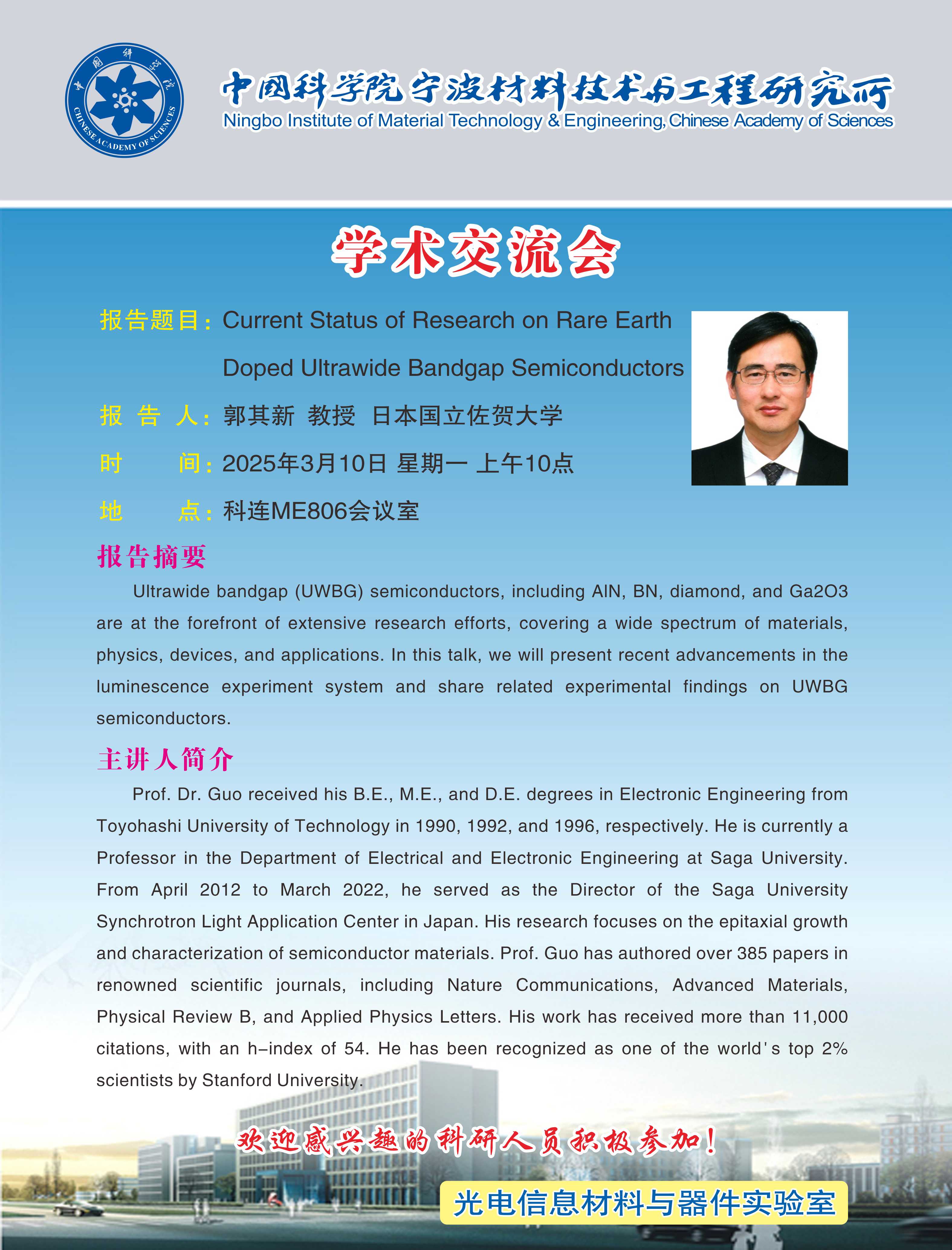 3月10日:郭其新:Current Status of Research on Rare EarthDoped Ultrawide Bandgap Semiconductors 发布:2025-02-25 点赞: 字号:小 大 打印: